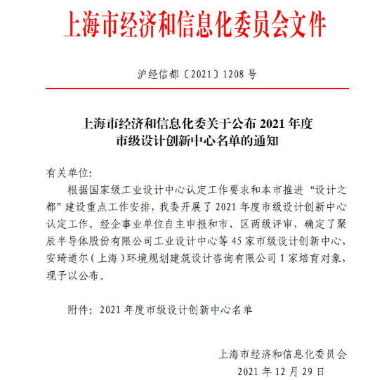 12月29日,上海市经济和信息化委员会公布了2021 年度市级设计创新中心名单。经过网上申报、区级推荐和市级评审等一系列严格的评审流程,尊龙凯时半导体股份有限公司工业设计中心获评市级企业设计创新中心,成为2021年收官之际的又一重大喜讯。